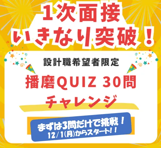 企画名は【設計職志望限定】1次面接いきなり突破!播磨Quiz30問チャレンジ!となっており、対象は2027年卒業予定の大学生や大学院生、高専生、短大生・専門学校生、及び第二新卒を含む希望者です。スーパーなエンジニアとして成長するための第一歩として、ぜひ挑戦してみてください。