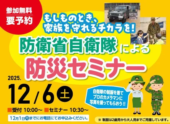 セミナー中は、防災に関する学びだけでなく、家族で楽しめるアクティビティも充実しています。自衛隊の制服を着て記念撮影ができる特別企画もあり、プロカメラマンが撮影を担当します。お子様の思い出作りにはぴったりの機会ですね。