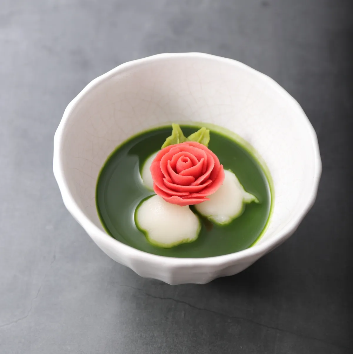 『花抹茶しるこ』(780円税込)は、何と言ってもその見た目が美しい。このスイーツでは、真っ赤な薔薇の花が餡から作られ、抹茶しるこの鮮やかな緑と見事にコントラストをなしています。お客様が自分の手で抹茶しるこを注ぎ入れるスタイルも楽しみの一環で、ひと際華やかな冬の風情を感じることができます。