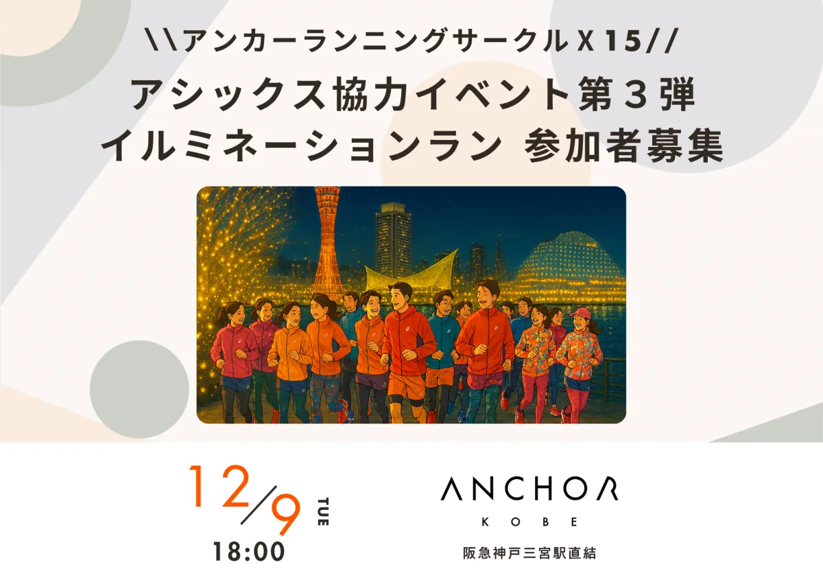 12月9日(火)、神戸にて「アンカー神戸ランニングサークルⅩ15」が主催する特別なランニングイベントが開催されます。このイベントは、アシックスの協力のもと、イルミネーションスポットを巡る内容で、夜の街を彩る美しい光景を楽しみながら、走ることができます。