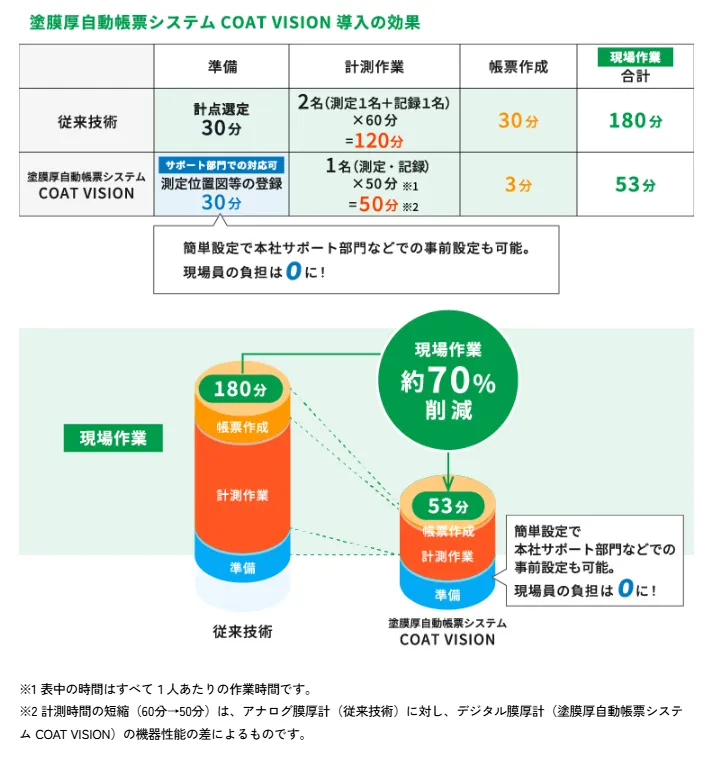 『COAT VISION』は、QRコードを用いて現場での測定位置を特定し、測定結果を即座にスマートフォンからクラウドにアップロード。これにより、手動記録が不要になるため、大幅な工数削減が期待できます。また、音声読み上げ機能を搭載しており、測定値の傾向をリアルタイムで把握することも可能です。