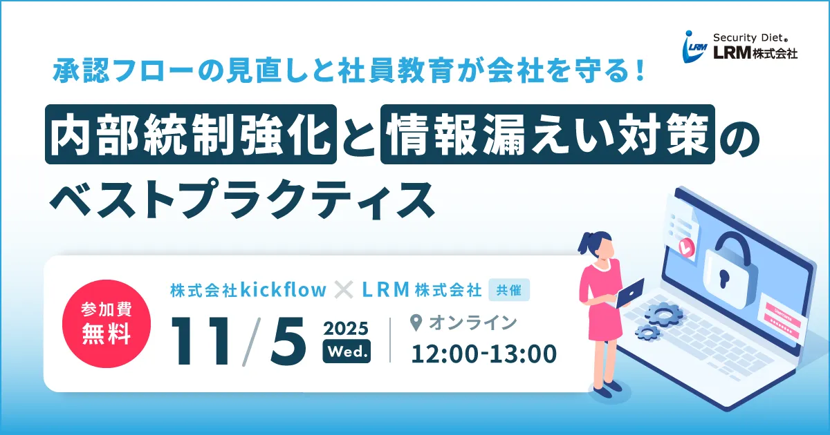 LRM株式会社(本社:兵庫県神戸市、CEO:幸松哲也)と株式会社kickflow(本社:東京都千代田区、代表取締役:重松泰斗)は、2025年11月5日(水)12時より、内部統制の強化と情報漏えい対策のベストプラクティスに関する無料セミナーを開催します。参加者はZoomで簡単に視聴できるため、企業の担当者や関心のある方々にとって手軽に参加できる機会となります。