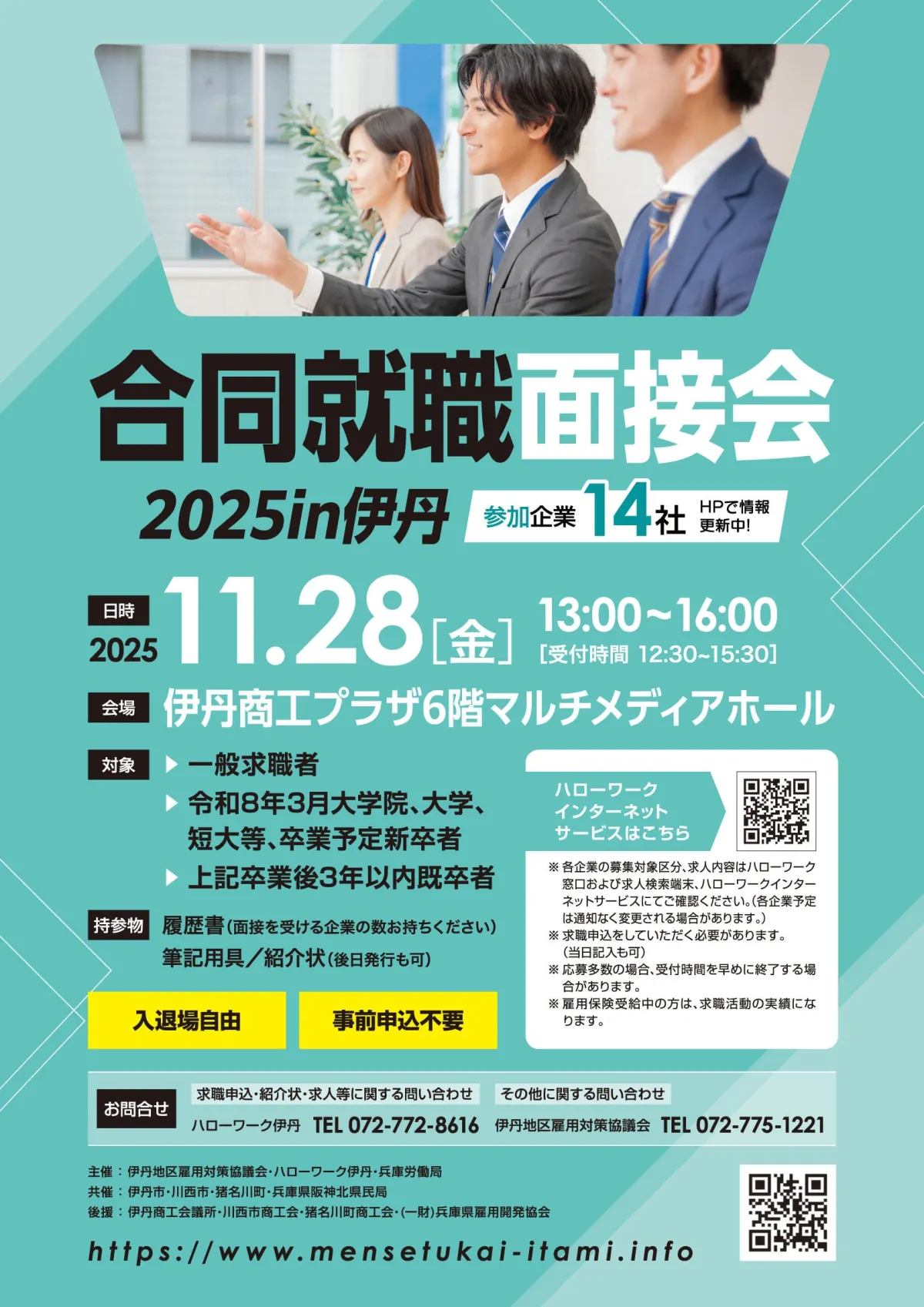兵庫県伊丹市にて、令和7年11月28日(金)に開催される「合同就職面接会2025 in伊丹」について、詳細をご紹介します。このイベントは、伊丹地区雇用対策協議会やハローワーク伊丹、兵庫労働局が主催し、一般求職者や新卒者を対象とした就職面接会です。伊丹市内を中心に14社の地元企業が参加します。
