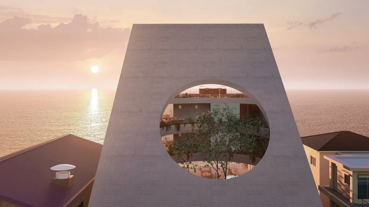 「UMITO 淡路島 オーシャンルーフ」(海の屋根)という名前は、夕日が海に沈む様子や、屋根の円形開口部で自然と対話を生むという意図があります。デザイン上は、三角形の屋根に設けられた丸い開口部が特徴で、夕日とのインタラクションを楽しむことができます。また、この構造物は、まるで淡路島に停泊した船のような外観を持ち、人々を惹きつける独特な存在感を与えます。