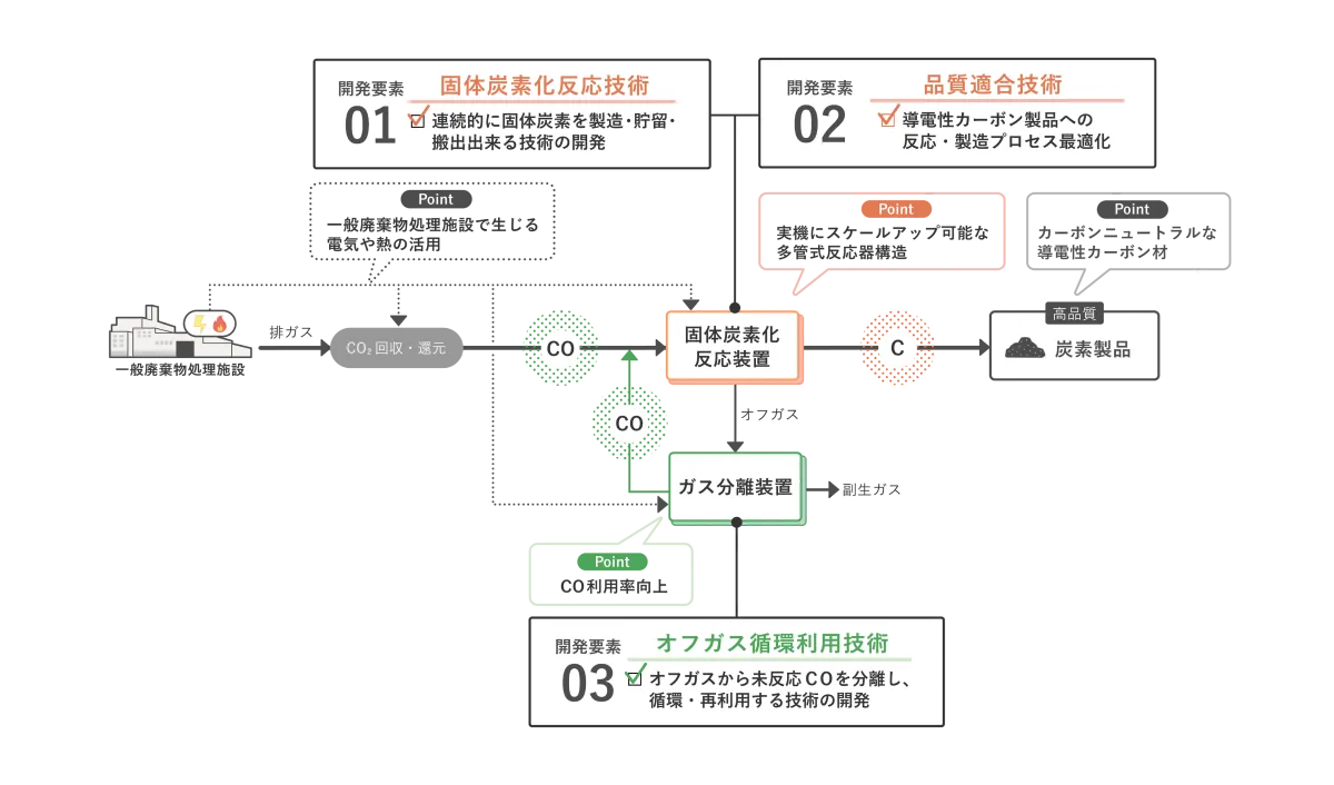 プロジェクトは2025年11月から2028年3月にかけて実施されます。スマートシティ企画はプロジェクト全体の管理と事業計画の立案を担当します。タクマは「固体炭素化システム」の開発に取り組み、このシステムは一般廃棄物の処理で排出されるCO2を分離・回収し、一酸化炭素に変換した後、固体炭素にするプロセスを持っています。