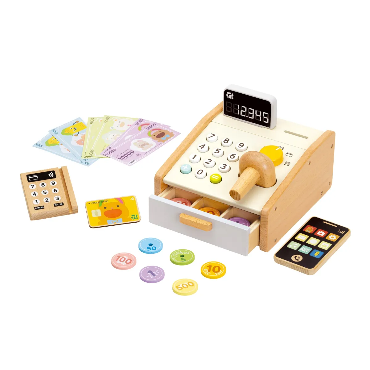 このレジスターセットの主素材は天然木で、安全基準(ST基準)をクリアした安心設計がなされています。「手で触れる」「音を出す」「動かす」といった五感を刺激する仕掛けが満載で、遊びの主役として“レジ”が大活躍します。これにより、ただの遊び道具から教育的な役割も果たすことができ、一石二鳥の価値を提供します。