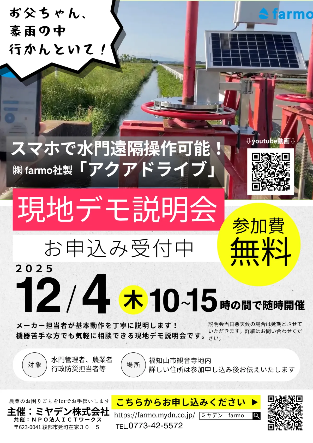 2025年12月4日(木)、京都府福知山市で、農業の現場を変えるスマホ水門操作システム「アクアドライブ」の現地デモ説明会が開催されます。このデモ会は、農業の安全を守るための新たな取り組みとして、近畿地区初の試みとなります。