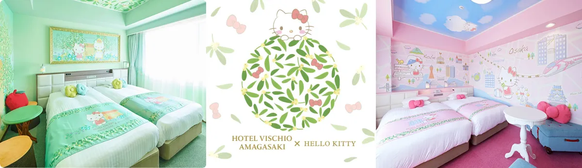 「ハローキティルーム」は、JR西日本ホテルズとサンリオの初のコラボレーションで、2つの異なるタイプのお部屋が設けられています。最初のお部屋は「ハローキティのおさんぽ in Kansaiルーム」。関西の観光名所をめぐるハローキティの様子がアートで表現されており、宿泊者はその空間で観光気分を楽しめます。もう一つの「ハローキティのヴィスキオの森ルーム」は、緑が基調のデザインが特徴で、ハローキティの森を訪れているかのような気分に浸れます。