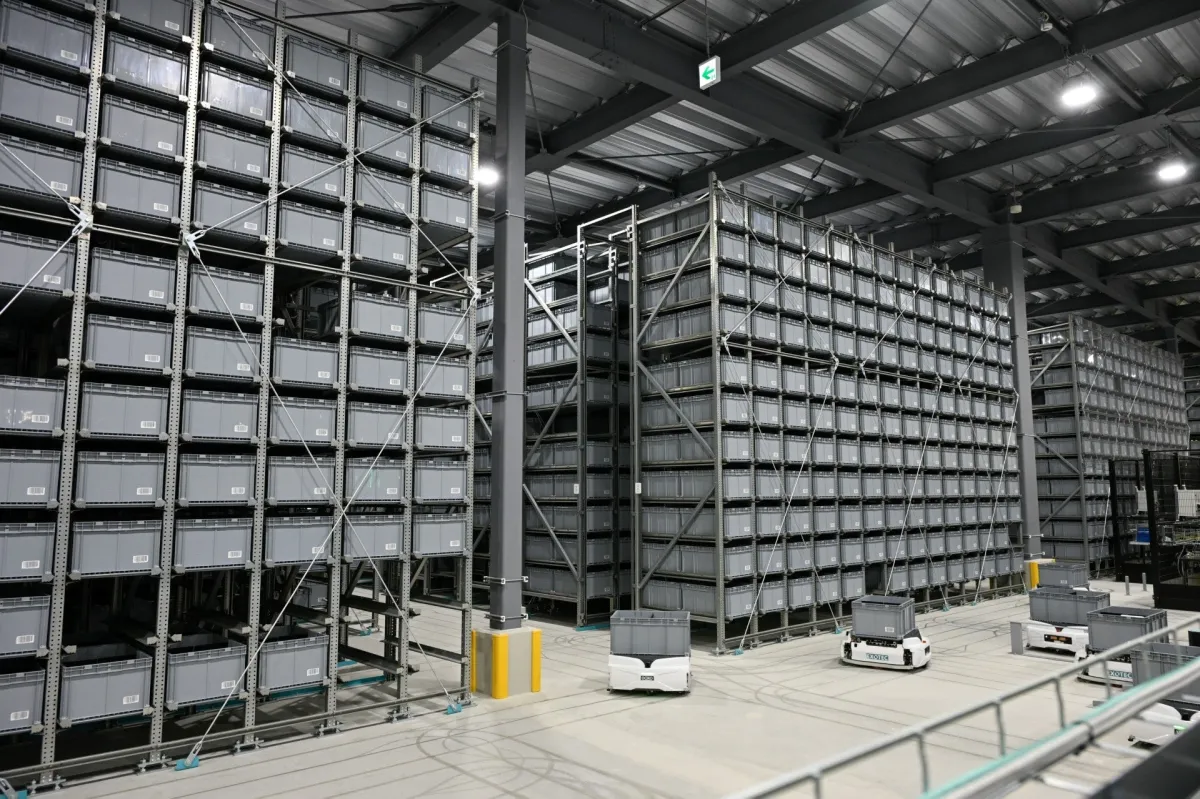 「Skypod」は、最大26台の搬送ロボットによって構成されており、それぞれが前後・左右・上下に移動できる能力を持っています。この高密度なラックに商品は2アイテムずつコンテナに入れられて格納され、すべての格納作業はロボットが担います。これにより、無駄のないスペースで最大5,670コンテナとおよそ12,000アイテムの保存が可能になります。