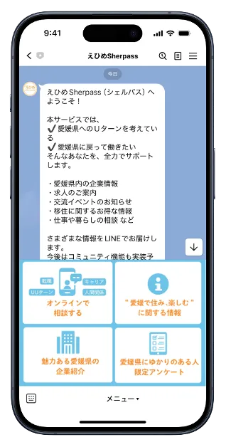 『えひめSherpass』では、愛媛県版「イクボス」制度に基づく「ひめボス認証企業」の情報をLINEで掲載します。これによって、信頼性の高い企業情報をいつでも確認できるため、安心して仕事を探すことができます。特に、Uターンを考えている若者にとっては、地元の企業情報を簡単に取得できるのは大きなメリットです。