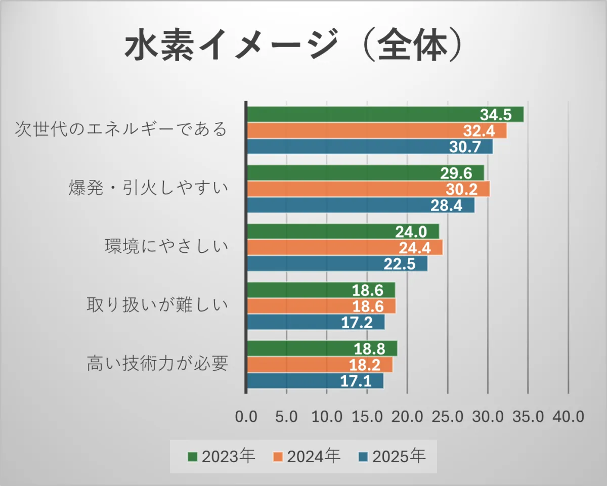 調査の結果、「水素社会」という言葉の認知度は26.0%と、前年の27.0%から2.9%低下しました。また、水素社会を身近に感じると回答した人の割合も25.4%に減少し、3年連続で3割を下回っています。このことから、水素社会というテーマは、まだ多くの人にとって身近な存在ではないことが浮き彫りになりました。